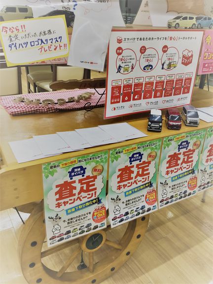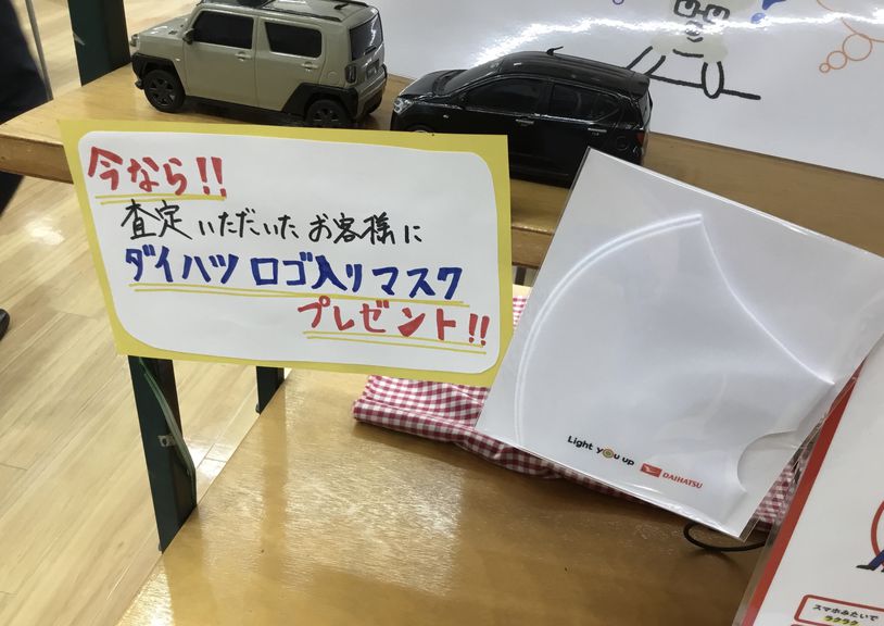 皆さんこんにちは!ダイハツ竜ケ崎店です😊ダイハツではロゴ入りのマスクを作成しました!!当社のマスクをコロナウイルスの感染対策にぜひご使用ください✨スタッフも感染対策をしっかりしております!!こちらのマスクは査定をさせていただいたお客様にプレゼントしております!楽しみにしててくださいね☺