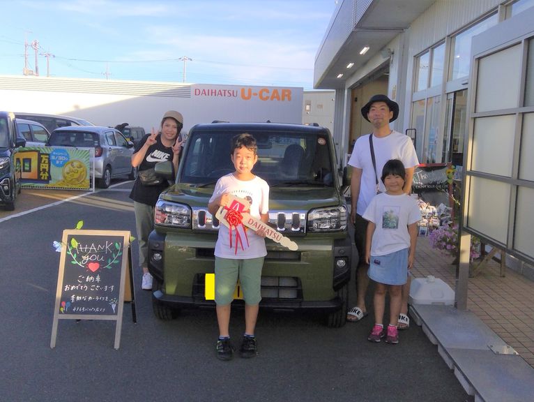 店長をはじめ、担当(鈴木)さんの分かりやすい明るい接客説明で、安心してとても分かりやすい納車となりました。新しい車との生活がとても楽しみとなりました!ありがとうございました!!(お客様より)本日は、ご納車をさせていただき誠にありがとうございました(*^-^*)これからのカーライフは、お任せください(^O^)/タフトと一緒に、たくさんの楽しい想い出と、笑顔を増やしてくださいね✨これからも末永くよろしくお願いいたします!(担当 鈴木)