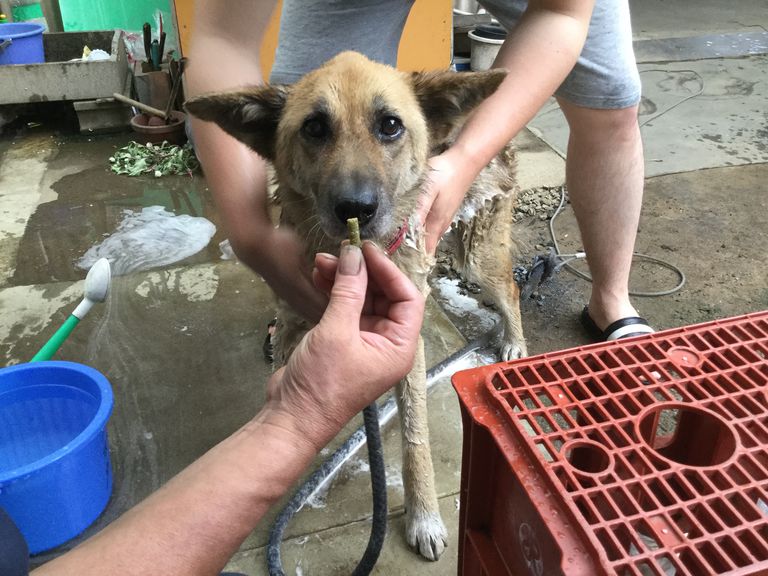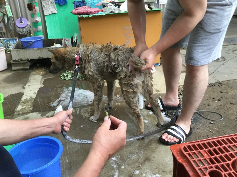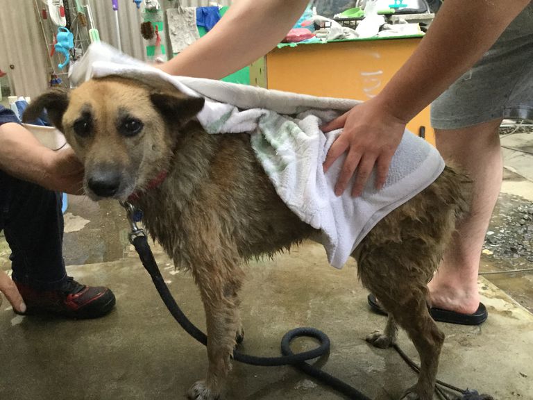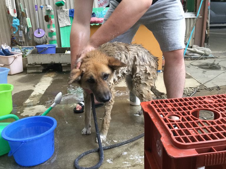 ・・ここからが本番! 濡れるのが大嫌いなのでおやつで釣ります