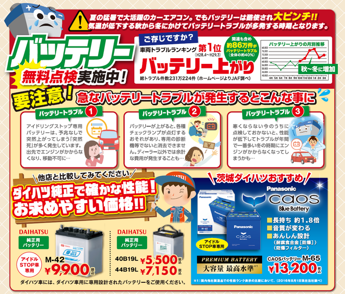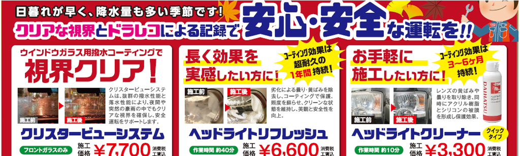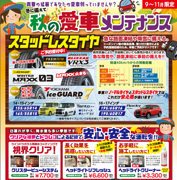 皆さまこんにちは!ダイハツ石岡店です!いつもブログをご覧いただきありがとうございます。9月も終わり、日が落ちる時間が早くなっているなか皆さまはいかがお過ごしでしょうか?今回サービススタッフKがお勧めしますのは、、、「秋の愛車メンテナンス」です!真夏の猛暑でお乗りいただいている愛車が弱っていませんか?日暮れが早くなり、冬になると路面凍結や降雪に備える必要があります。トラブルが起きる前に早めの対策・ご予約をお待ちしております。