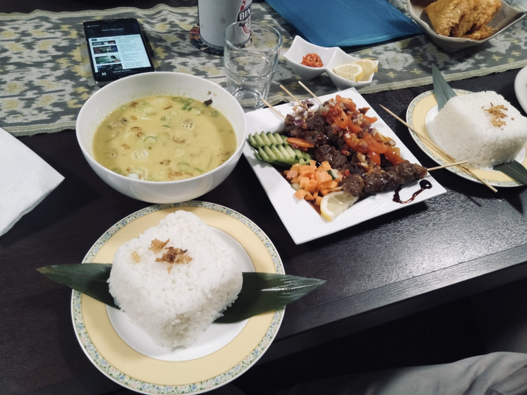「サテ カンビン」(ヤギ肉の串焼き)と「オボル アナム」(鶏肉のココナッツスープ)です。とても美味しいです(*'ω'*)