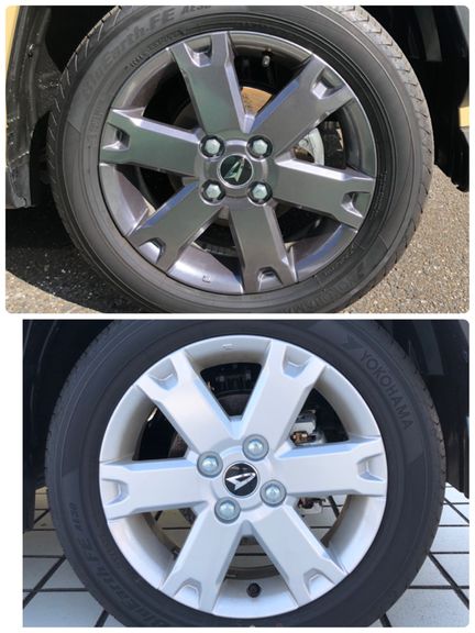 純正アルミも最近はこんなにオシャレに、14インチサイズが一般的です。