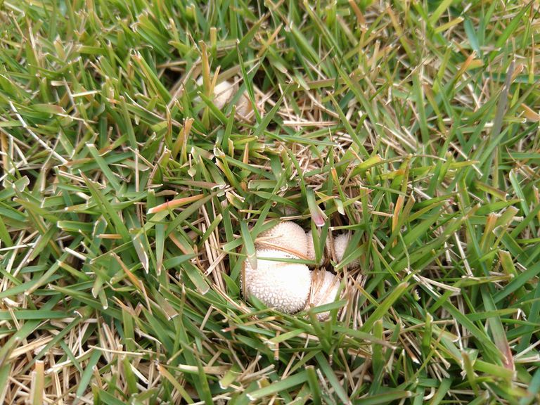 調べたらキノコはホコリタケというキノコでいつもスコップでホジホジしてますがあまりひどい時は殺菌剤でやっつけるようです。