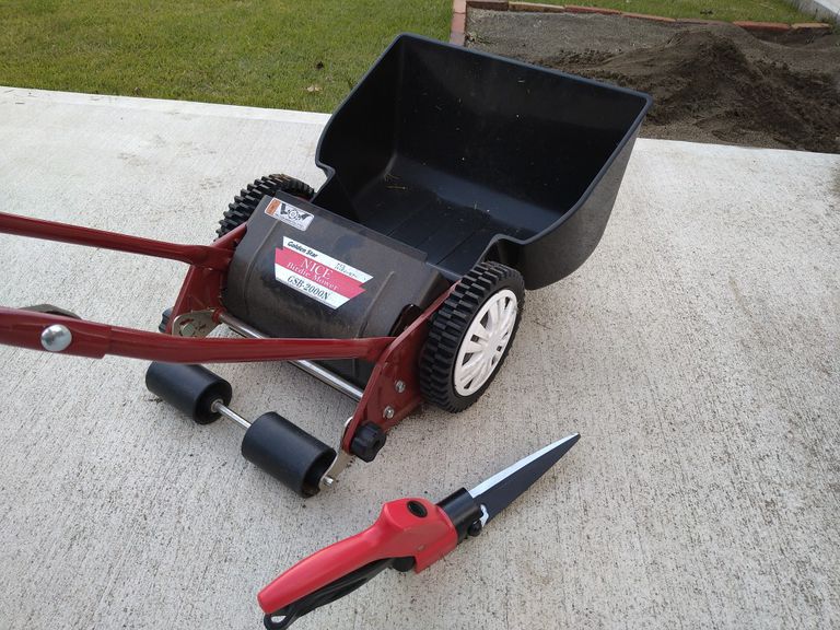 愛用の道具です。キワ刈り用のはさみと手押し式の芝刈り機”ナイスバーディー”です。ゴルフがしたくなる名前ですね。