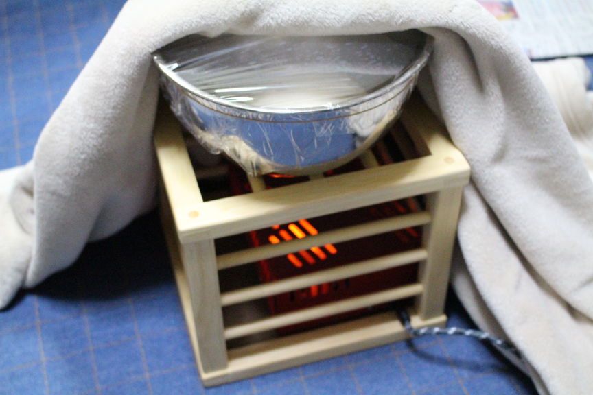 丸めてボールの中に入れ こたつの中に入れ約50分(一次発酵)