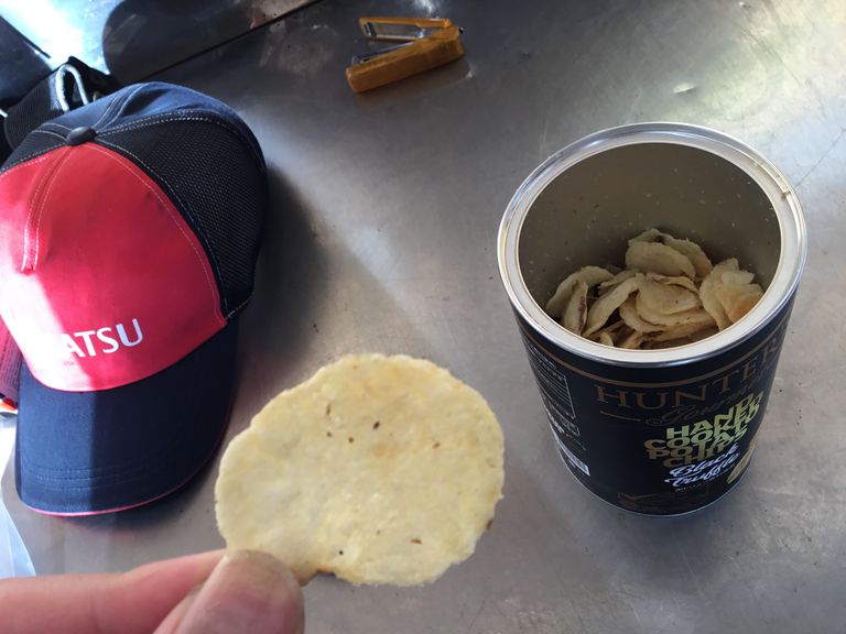 12月某日、工場長が謎の缶を持ってきた。「差し入れもってきた。みんなで食べてね」見慣れないパッケージだが、ポテトチップスと書いてあるのは分かった。今日は厳しい寒波に襲われ、少しでも油っこいものを口に含みたい気分だった。工場長は、現場の気分が、お見通しのようだ。とは言え、ハンターズというポテトチップスなど聞いた事もなく、ましてや黒トリュフ味だなんで。