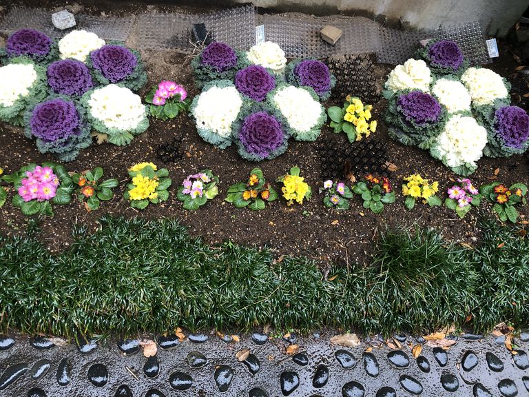 地植えの葉牡丹とジュリアンです。土をほじくり返す野良猫とのバトル中です(>_<)