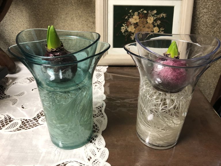 シューズボックス上でもガーデニング中です(ヒヤシンスの水栽培)