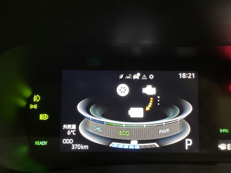 液晶モニターでモーターだけで走っていたりエンジンが回っているとかなどが一目で分かりますよ!ちなみに減速時にはタイヤマークからバッテリーマークに矢印が伸びますよ☆
