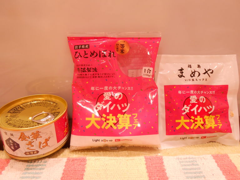 ご来場記念で「お米」「さば缶」「いり豆」のいずれかひとつ