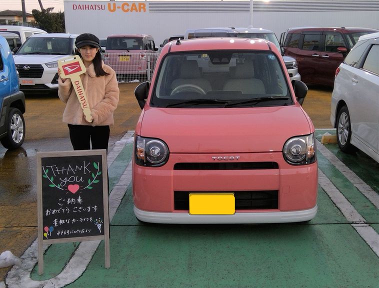 【車種】トコット 【ボディカラー】ジューシーピンクM 【この車で一番最初に行きたい場所は?】🏰ディズニーランドに行きたいです!!(^-^) 【お客様からの一言】購入に関してご親切に対応していただきありがとうございました。 【営業担当 鈴木より】本日は、ご納車させていただきありがとうございます(*^-^*)たくさん楽しい想い出を作ってくださいね!!これからのカーライフは、安心してお任せください(^^)/しっかりとサポートさせていただきます♬どうぞ末永くよろしくお願いいたします。