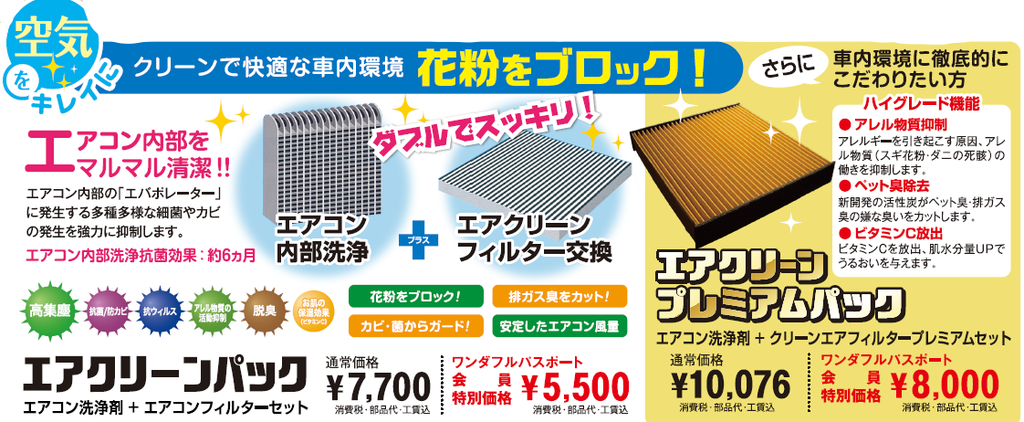 アレル物質抑制や強力脱臭効果、ビタミンC放出のエアコンクリーンフィルタープレミアムに交換とエアコン内部洗浄がセットになって通常価格¥10,076の所、ワンダフルパスポート会員様は特別価格の「¥8,000」で施工できます!