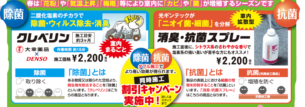 車内の除菌やウイルス除去、消臭効果のあるクレベリン施工も「¥2,200」で施工出来ます!