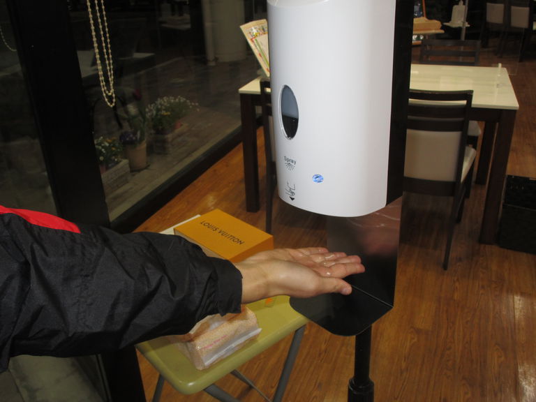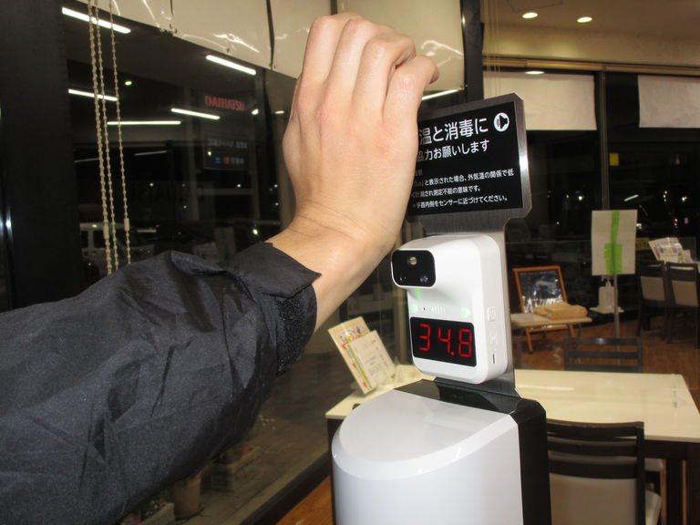 お店に入ると、自動で体温測定とアルコール液射出をしてくれる、街中でよく見るアレです。