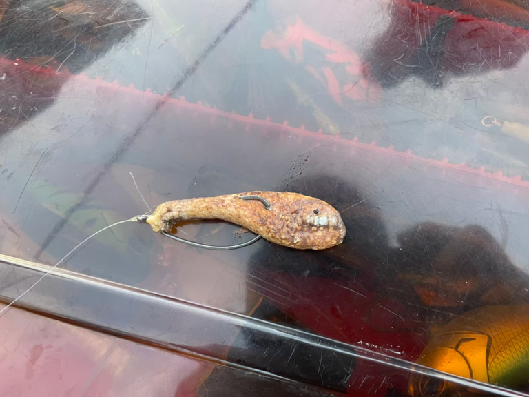 こちらは、豚皮のルアーです。河口湖はワームは禁止なので~こちらを使っていきます。