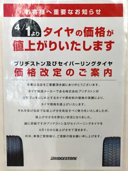 こんにちは。ダイハツ石岡店です。いつもブログをご覧いただきありがとうございます。今回のブログはサービススタッフMからのご連絡になります。ブリヂストンタイヤをご利用いただいている方ーーー4月1日より値上がりすることが決定いたしました!「7%ー10%」 天然ゴムを始めとするタイヤ原材料の価格が高騰している為だとのことです。このブログをご覧の皆様、タイヤの溝は大丈夫でしょうか、、、見積りのご相談はダイハツ石岡店までご連絡をお待ちしております!