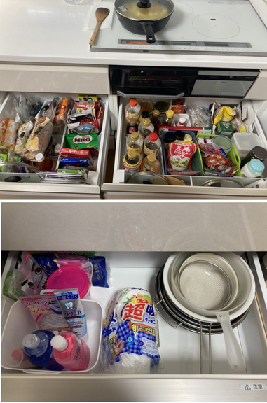 引き出しの中は「動線」を考えて常にきれいに並べて整頓してます♪料理中にも置きっぱなしにしないことが重要です。