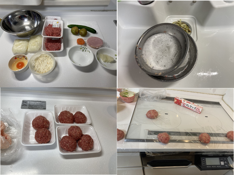 ハンバーグも無駄に器を使わずラップを利用して作る。使い終わったボウルはすぐに水につけて洗いやすくしておきます!