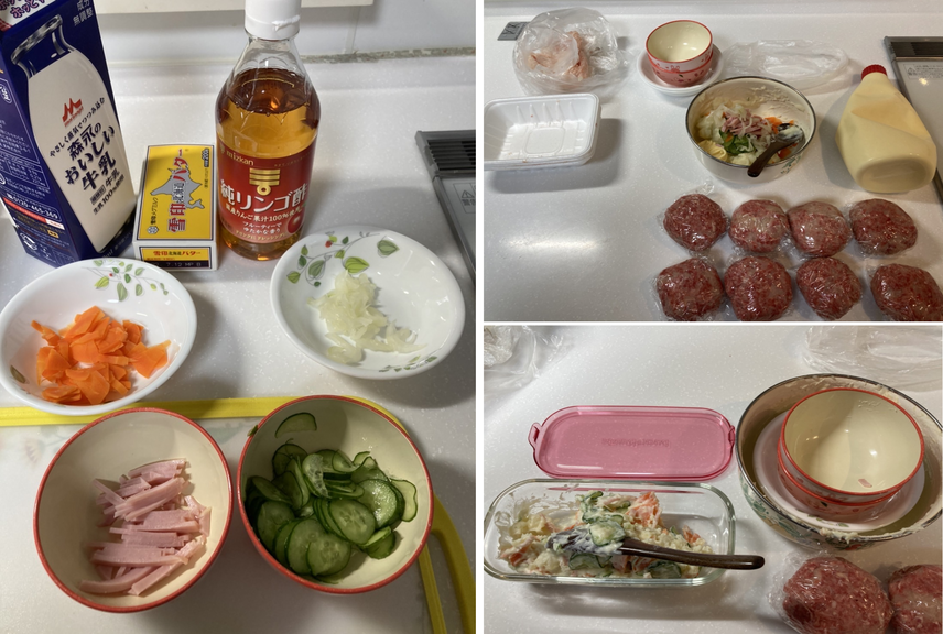 ポテトサラダを作る際にも食材を小分けに並べて作りやすくしてます。作り置きのため器にいれれば完成。