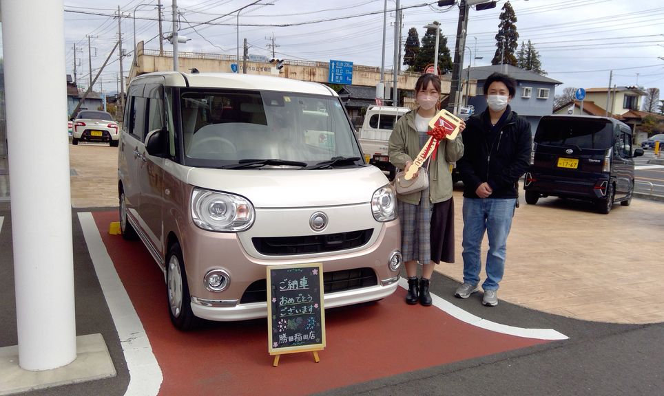 【車種】ムーヴキャンバス 【ボディカラー】パールホワイト×ライトローズ 【この車で一番最初に行きたい場所は?】ピンクの車で春なのでイチゴ狩り🍓 【お客様からの一言】買い替えを検討し探していたところ、ちょうど良いタイミングで好みの可愛い車に出会えました。対応して頂いたスタッフの方々も温かく、素敵なところでした。ありがとうございました。 【営業担当より】温かいお言葉ありがとうございます。可愛いキャンバスとご家族で沢山思い出を作ってください! イチゴ狩りも行けますように…♪