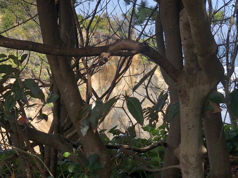 柵の横に立つ木々の隙間から見える、となりの区画の崖。