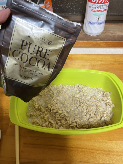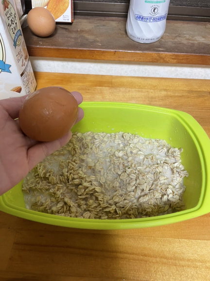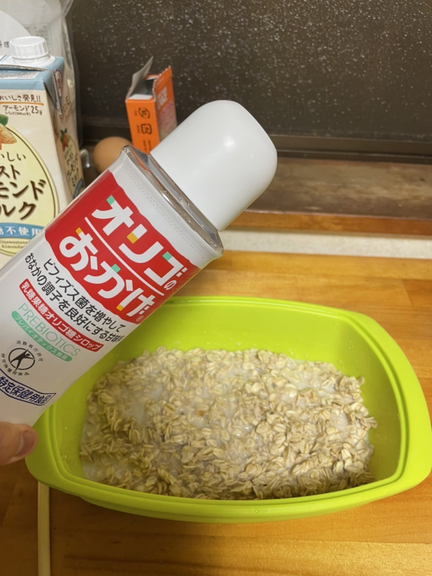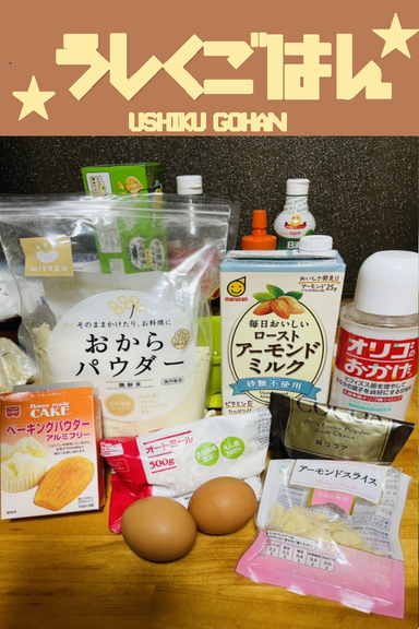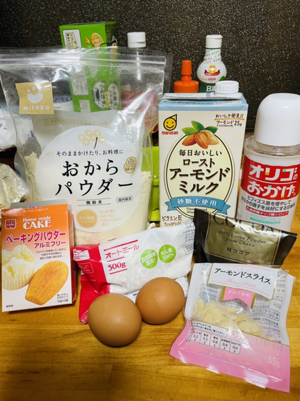 材料:オートミール・アーモンドミルク(砂糖不使用)・おからパウダー・ベーキングパウダー・アーモンドスライス・ココアパウダー・卵・オリゴ糖シロップ