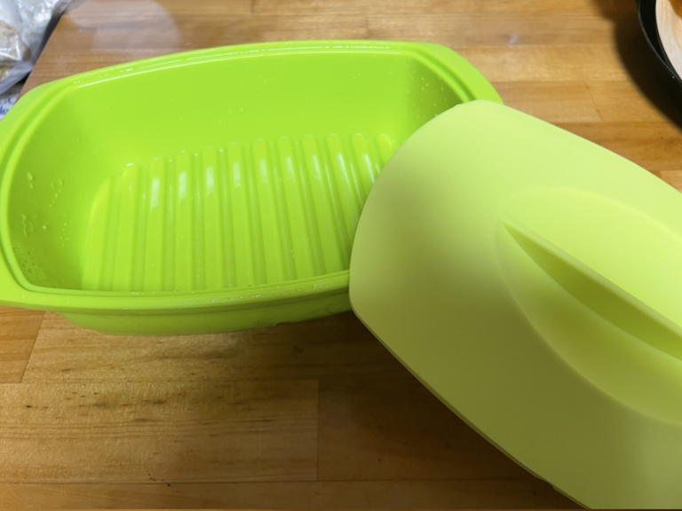 こちらのレンジで使えるシリコン容器に材料を入れまーす。