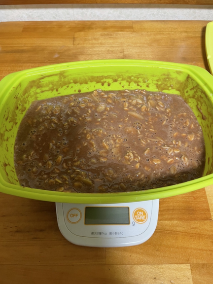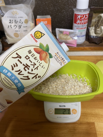 材料:オートミール・おからパウダー・アーモンドミルク(砂糖不使用)・ベーキングパウダー・アーモンドスライス・ココアパウダー・卵・乳糖果糖オリゴ糖シロップ