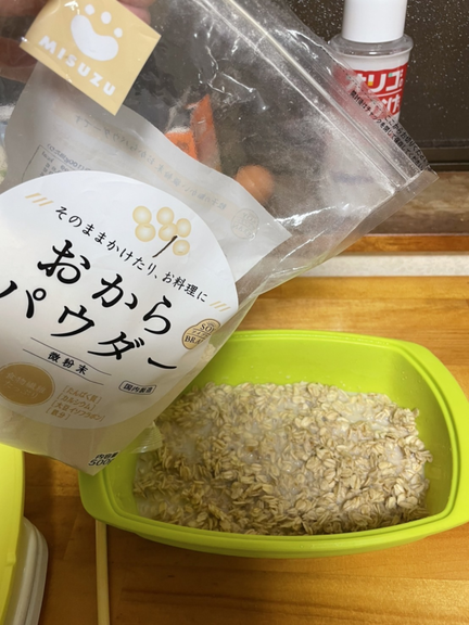 次に、おからパウダー10g 食物繊維・タンパク質・カルシウム・マグネシウム・カリウム・オリゴ糖・ビタミンEなどの栄養素たっぷり(;^ω^)