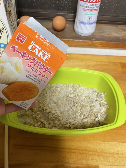 アーモンドスライス少々とベーキングパウダー小さじ1を入れる~('ω')ノ
