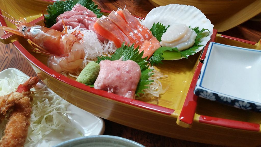 お刺身がとっても新鮮で、切り身が分厚く、エビがめっちゃでかい🦐