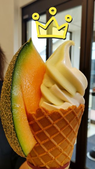 敷地内にカフェもあり、メロンのソフトクリーム を販売していました。なんて贅沢なソフトクリームでしょう✨ ソフトクリームの横にあるメロンの存在感!!まいう~♬