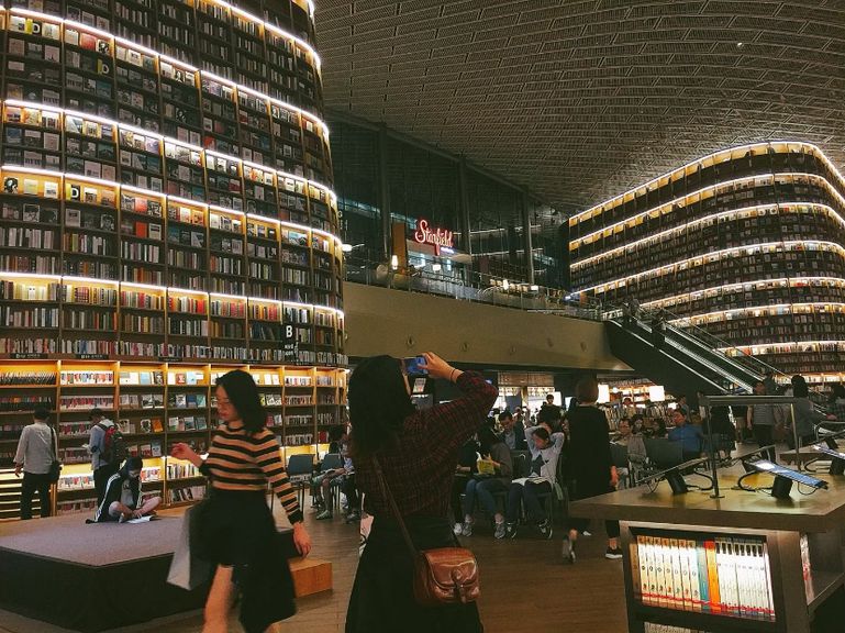 最後に、ビョルマダン図書館です!ソウルのショッピングセンターの中にあり、誰でも入ることができます。天井まで続く本棚にはたくさんの本が飾られており、思わずその大きさに圧倒されました。歩き疲れたときに柔らかな間接照明の明かりと本に囲まれながらゆっくり時間を過ごすのもいいかもしれません📚☕