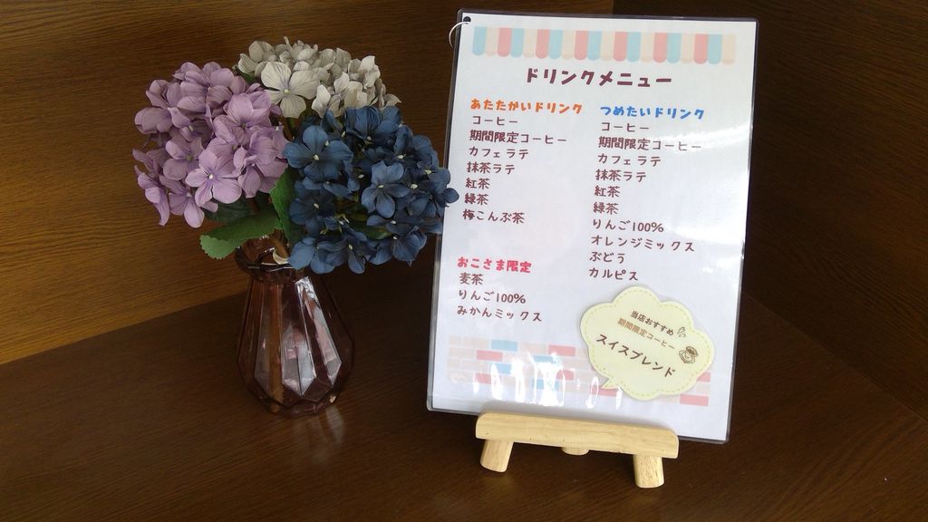 下妻店ドリンクメニューです(^^♪おすすめは、ぶどうジュース🍹今月のおもてなしスイーツは、「アーモンドフロランタン」です。ご来店お待ちしております(^^)