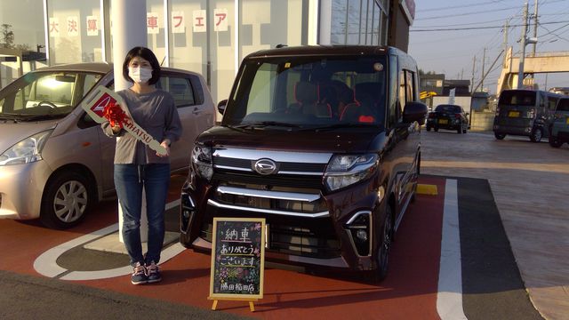 この度は、タントカスタムのご納車ありがとうございました!カッコいいタントカスタムで思い出をたくさん作ってください!今後とも末永いお付き合いをよろしくお願い致します。担当:曽根