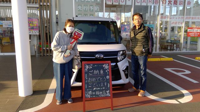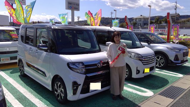 お客様の声「待ちに待ったタントカスタム4WD!今日からちょっと遠出」ご納車させていただきありがとうございました。お車大変お待たせ致しました!今後とも末永いお付き合いをよろしくお願い致します。担当住谷