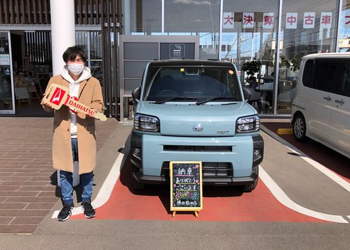 ~お客様の声~タフトで色々なところへ行きたいです!この度はご納車させていただきありがとうございました!ぜひタフトでドライブ楽しんでください(^^)今後とも末永いお付き合いをよろしくお願いいたします。担当滑…