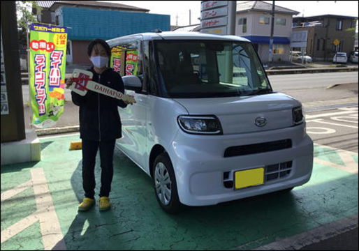この度はご納車おめでとうございます。日頃よりダイハツ石岡店をご贔屓いただきありがとうございます。パールの入ったホワイトで毎日の運転も気分が明るくなりますね♪先進の機能が付いた新型タントで沢山の思い出を…