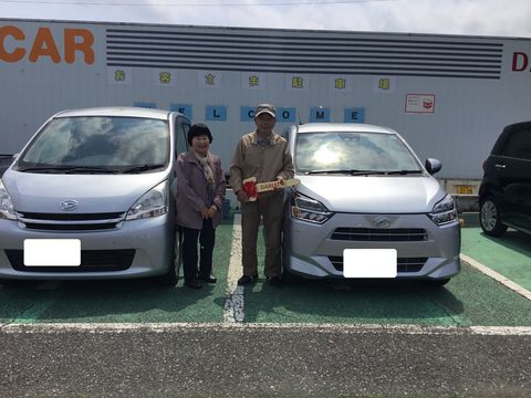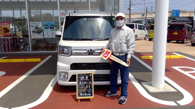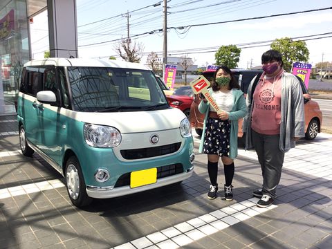 お客様の声「いい車だね!大切に乗ります!」この度はご納車させていただきありがとうございました。ハイゼットカーゴから今回ウェイクに代替えということで引き続きダイハツをよろしくお願い致します。担当住谷