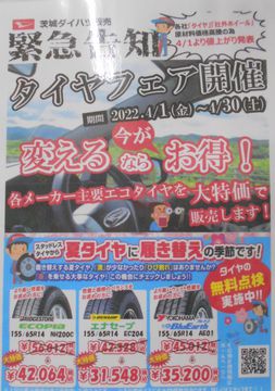 こんにちは!ダイハツ日立店サービススタッフMです。今回は大事なお知らせがありますので記事にさせて頂きました。4月から大手タイヤメーカー各社が原材料高騰に伴いまして7~10%出荷価格の値上げを発表しておりま…