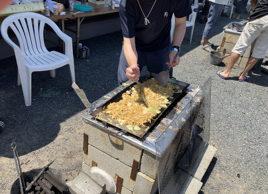 本格的な炭火でのBBQは、鳥に豚に牛とフルラインナップ🍖で勢揃い! 玉ねぎ、ナスなどの野菜🍆も完備とパーフェクト!! 〆は焼きそばと完璧なBBQで大盛り上がり!!