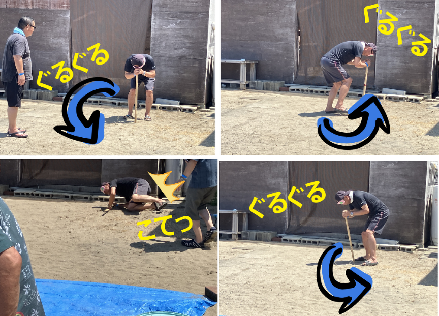 そして、最後はお子様によるスイカ割大会!! デモンストレーションを私が担当しましたが、棒を額に当ててグルグル回ると、あれま~!!地球もグルグル・・・・そりゃそうだ、酔っ払いだもの~!!!